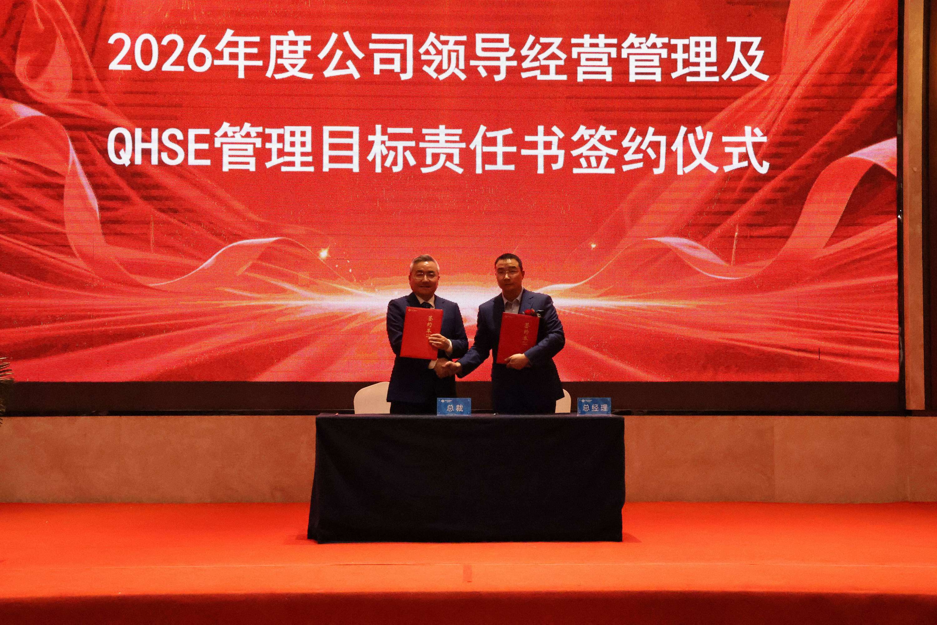 以签约定职责,以责任促落地!大会现场,黄健民董事长与各事业部总经理郑重签署2026年QHSE及经营管理目标责任书,进一步明确管理职责、敲定年度工作目标,为新一年QHSE和各项经营管理工作落地筑牢刚性约束、压实管理责任。